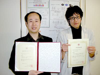 受賞題目「直鎖状及びリング状Re(I)多核錯体から連結したRu(II)錯体への光エネルギー集約」(山本さん) 受賞題目「ルテニウム(II)錯体によるNADモデル化合物の光触媒的ヒドリド還元反応の機構とその高効率化」 (松原くん)